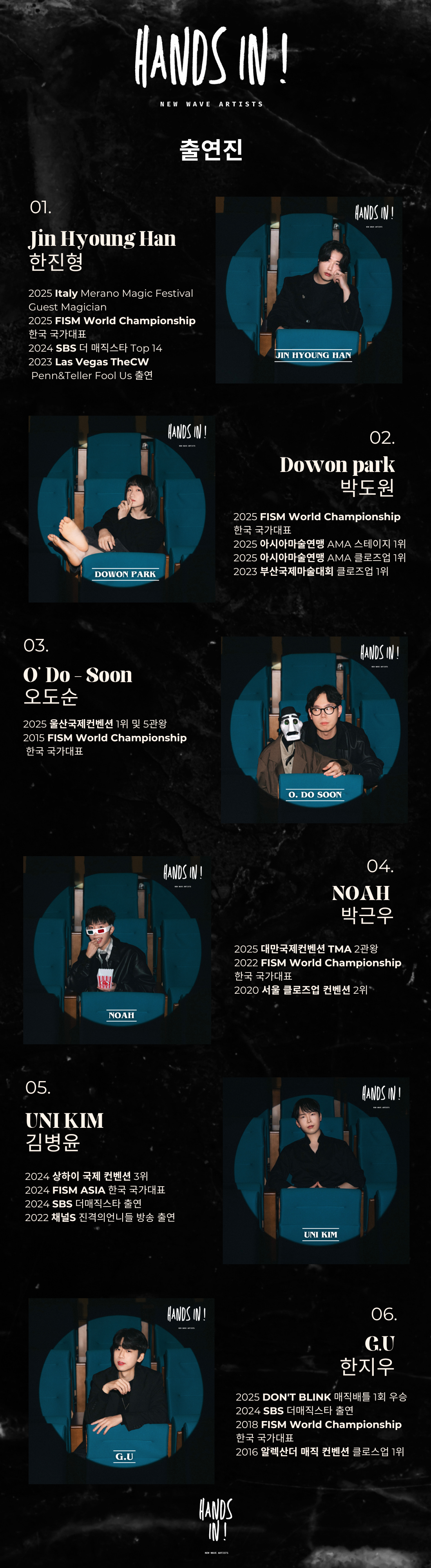 [공연소개] 각자의 자리에서 활발하게 활동하고 있는 6명의 신세대 클로즈업 마술사들이 한자리에 모였습니다. 그동안 몇몇 무대나 영상으로만 볼 수 있었던 작품들 쉽게 마주할 수 없었던 그들의 마술을 이번 기회에 눈앞에서 한 번에 만날 수 있습니다. 흔하게 만들어지는 조합은 아니기에, 이번 무대는 더욱 의미 있게 다가올 것입니다. 그렇기에 이 순간을 많은분들과 함께 나누었으면 합니다.