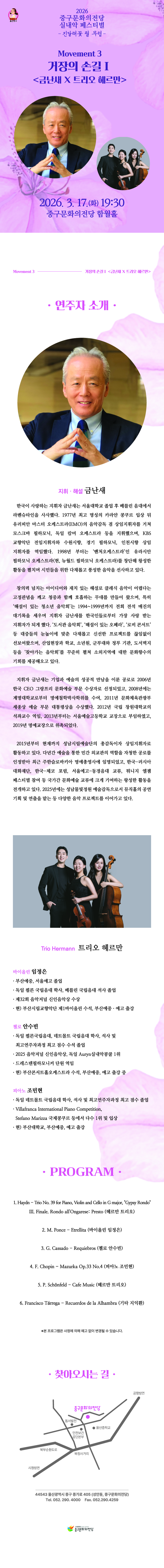 ![중구문화의전당 실내악페스티벌: 진달래꽃 필 무렵, 거장의 손길 Ⅰ. 금난새 X 트리오 헤르만 [울산] 상세 1](http://www.kopis.or.kr/upload/pfmIntroImage/PF_PF284157_202601300142168610.jpg)