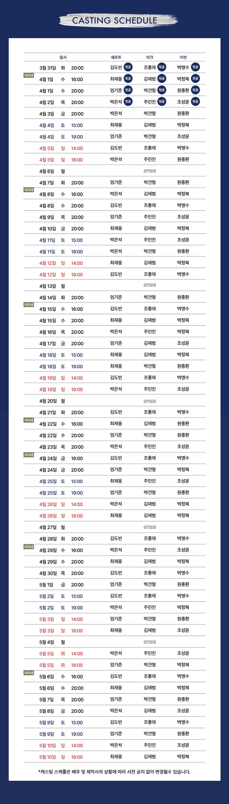 화요일(20:00), 수요일(16:00,20:00), 목요일 ~ 금요일(20:00), 토요일(15:00,19:00), 일요일(14:00,18:00), HOL(14:00,18:00)