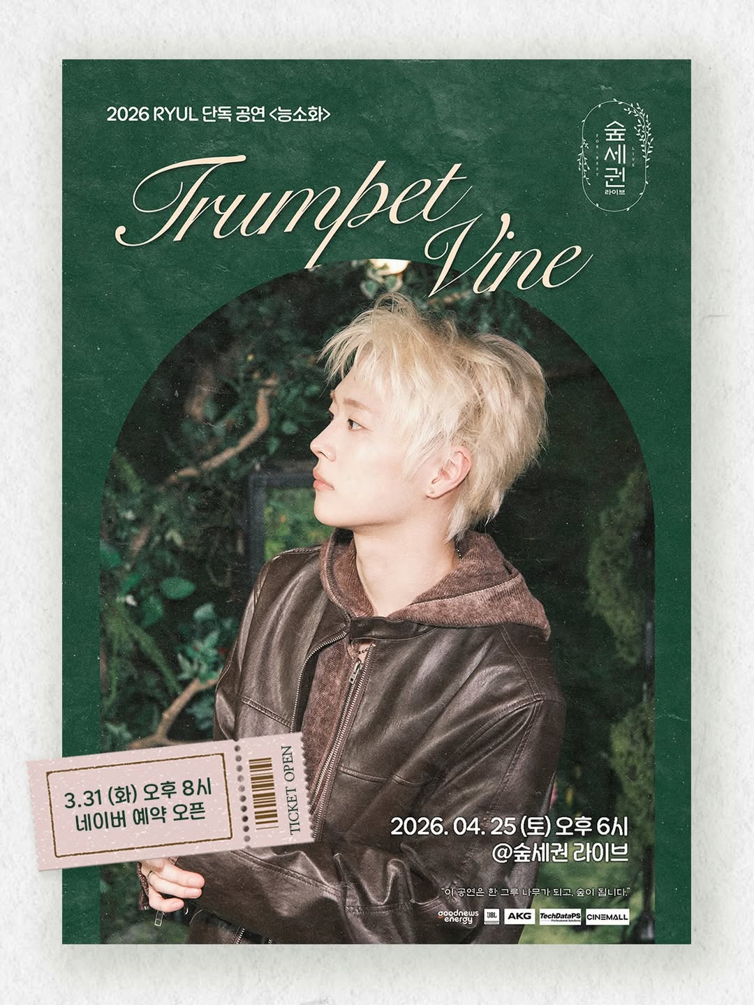 [공연소개] 조용히 피어나 오래 남는 것들처럼, RYUL의 음악은 장르를 넘어 하나의 결로 이어집니다. R&B, 팝, 드럼 앤 베이스까지 다양한 스펙트럼 위에서 만들어진 사운드는 이번 공연에서 더욱 솔직하고 입체적인 순간으로 펼쳐집니다. <능소화>는 시간이 지나도 잊히지 않는 감정처럼, RYUL이 쌓아온 음악과 지금의 감각이 만나는 자리입니다. 숲세권 라이브의 가장 가까운 거리에서, 그 변화의 순간을 함께 마주해 주세요.