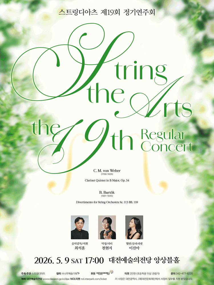 [공연소개] 2004년 창단 이후 매해 정기연주회를 이어오며 현악기의 매력을 보여주는 현악오케스트라 ‘스트링디아츠(String the Arts)’의 19회 정기연주회이자 2026년 정기연주회가 열린다. 스트링디아츠는 음악감독이자 지휘자인 최석훈을 중심으로 모인 청년 현악연주자들이 만든 현악오케스트라 단체로, 깊이 있는 해석과 열정적 무대를 통해 꾸준히 관객과 소통해왔다. 이번 정기연주회는 낭만과 현대의 대비가 돋보인다. 1부에서는 클라리네티스트 이진아가 협연하는 베버의 <클라리넷 5중주>를 통해 화려하고 서정적인 선율을 선사한다. 2부에서는 2차 세계 대전 직전 작곡된 곡으로 시대적 긴장과 민속적 활력이 공존하는 바르톡의 <디베르티멘토>를 연주해 현악 오케스트라만의 강렬한 에너지를 전한다. 관객은 현악오케스트라가 만들어내는 풍성한 음향 속에서 음악의 아름다움뿐만 아니라 예술이 시대와 함께 호흡하는 힘을 경험하게 될 것이다. [PROGRAM] C. M. von Weber(1786-1826) 베버 Clarinet Quintet, Op. 34 클라리넷 5중주 내림나장조, 작품 34 I. .Allegro II. Fantasia. Adagio III. Menuetto IV. Rondo. Allegro 협연 : 클라리넷 이진아 Intermission B. Bartók(1881-1945) 바르톡 Divertimento for String Orchestra Sz. 113 현악오케스트라를 위한 디베르티멘토, 작품 113 I. Allegro non troppo II. Molto adagio III. Allegro assai